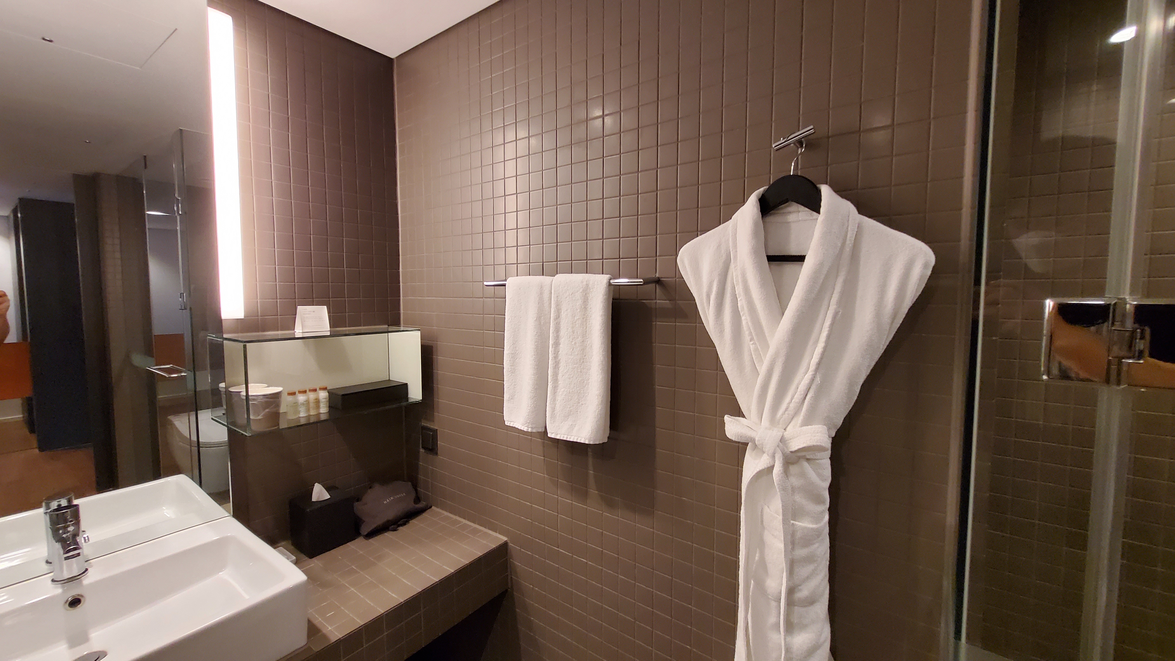 긴 복도 끝에는 세면대와 샤워가운 그리고 수건들이 있었어요.