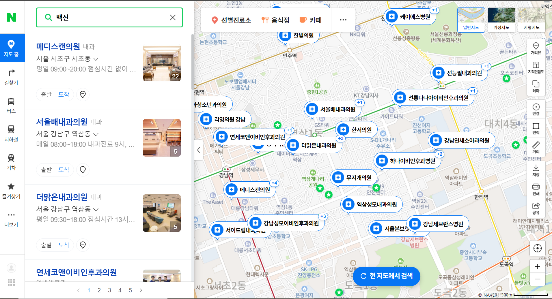 저 같은 경우는 네이버 지도에서 백신이라고 검색해서 집 근처에서 백신 접종이 되는 병원들 확인해서 그중에서 제일 가까운 곳으로 선택했어요.