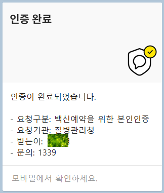 그러면 다시 백신 예약 사이트로 돌아와서 인증완료 버튼을 눌러주시면 됩니다.