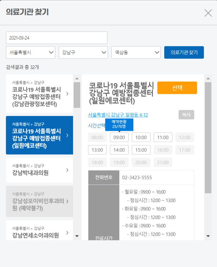 예방접종 맞을 센터를 선택하면 오른쪽 화면에 접종 가능시간이 나옵니다.