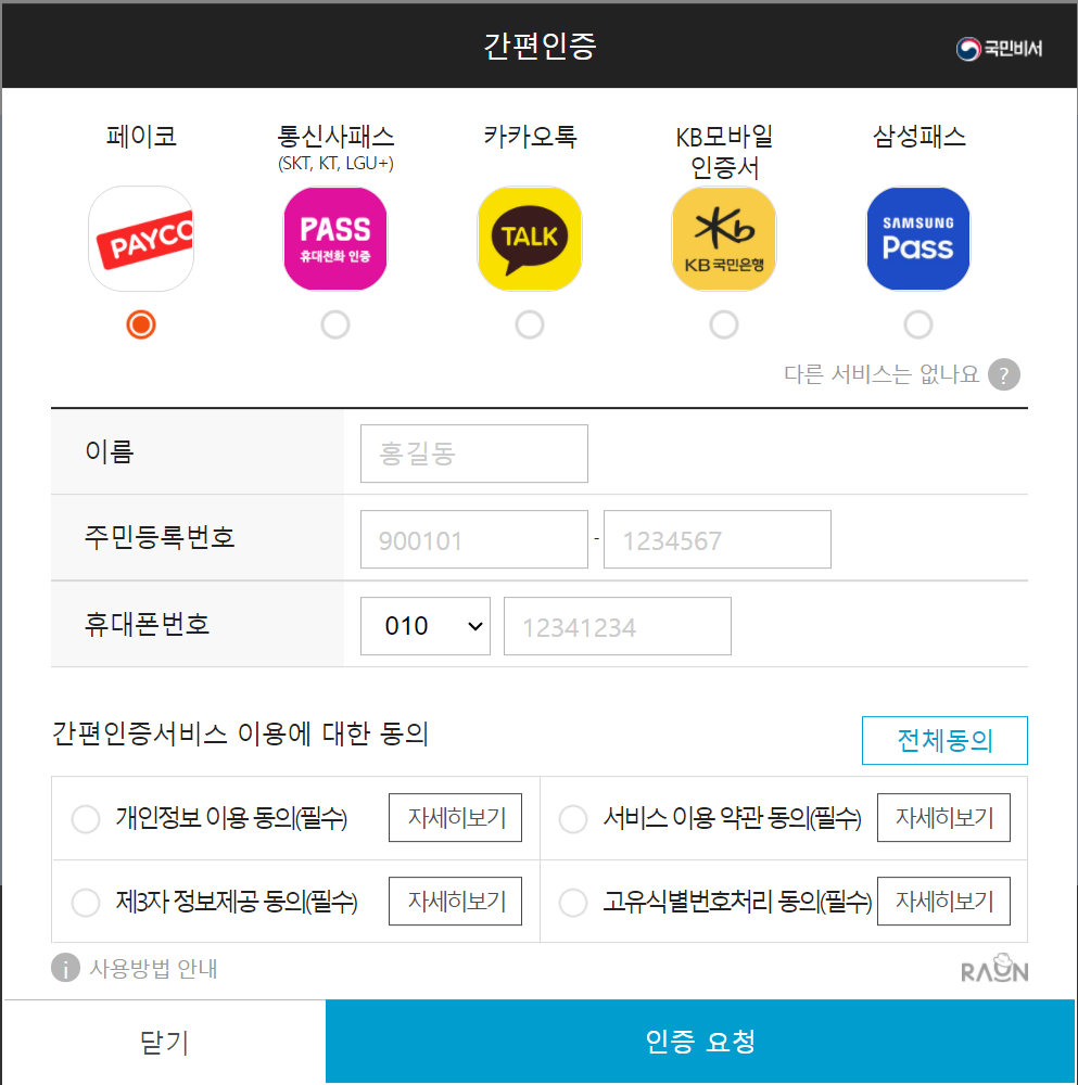 페이코나, 카카오톡 등으로 간편 인증이 필요했어요.