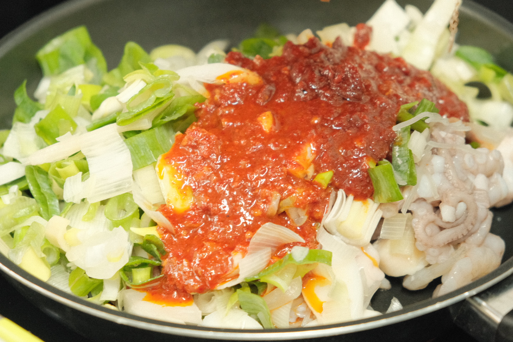 프라이팬에 야채 낙지를 한 번에 다 넣고 불을 올렸어요