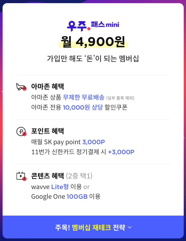 시작 초기라 여러 가지 프로모션이 진행 중이라 우주 패스는 가입할만한데 계속 사용할지 말지는 생각해보세요