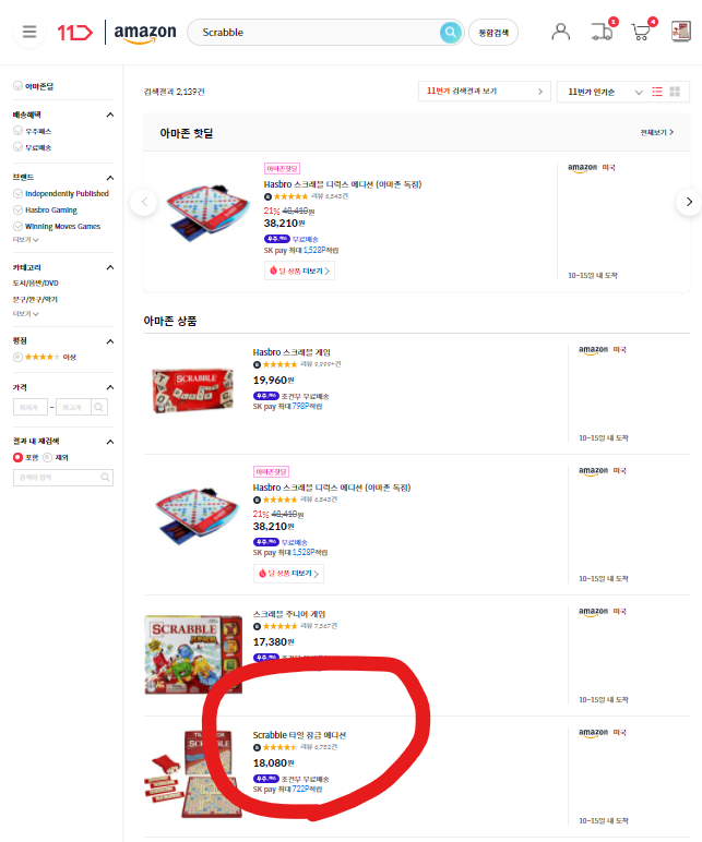 그리고 아래가 11번가에서 검색한 값인데, 좌: 영문 scrabble, 우: 한글 스크래블로 검색한 결과 값이에요