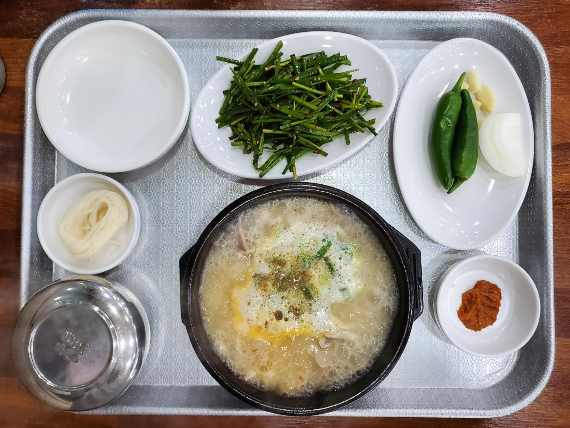 기본적으로 부추(정구지 김치)랑 양파와 마늘 고추가 나오고 소면도 나왔어요.