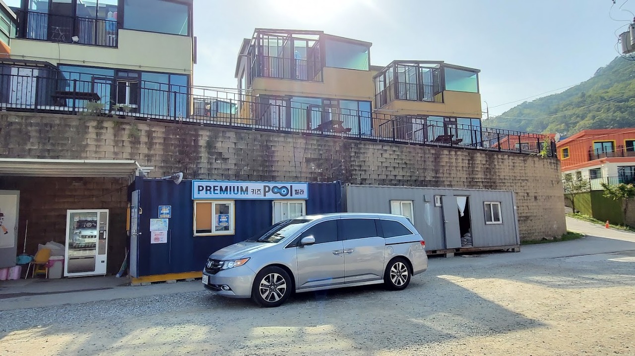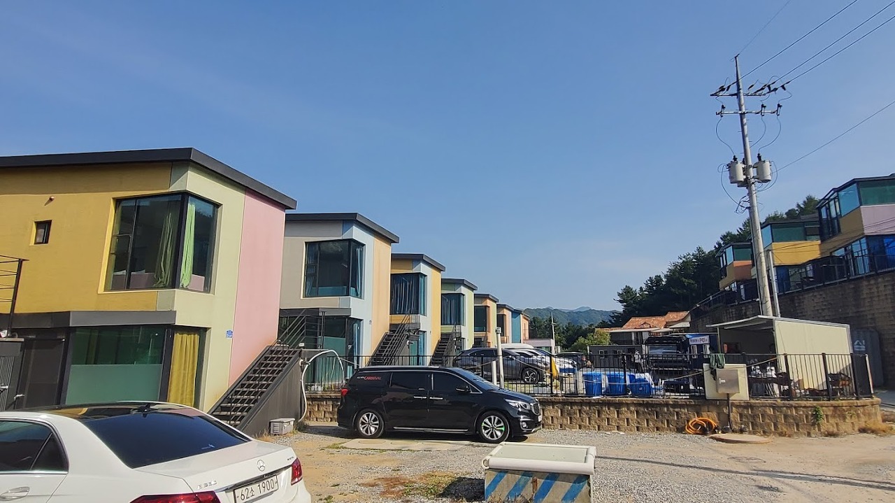 숙소 앞에 주차할 수 있게끔 되어있고, 방은 1, 2층으로 나눠져 있는데 저희는 2층에 배정되었어요