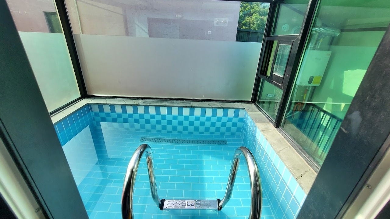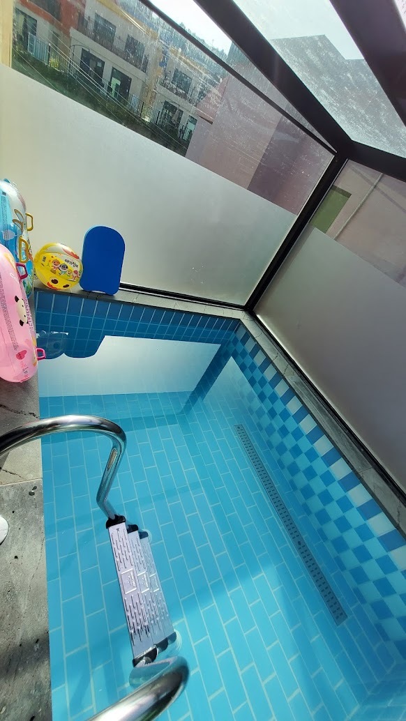 제일 중요한, 풀장은 거실에 나무계단을 지나가면 있어요