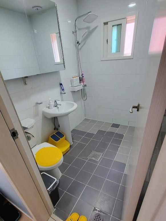 키즈 펜션이다 보니 부모랑 아이랑 화장실에 같이 들어갈 수 있게 신발도 준비되어 있고, 공간도 넓은 편이었어요