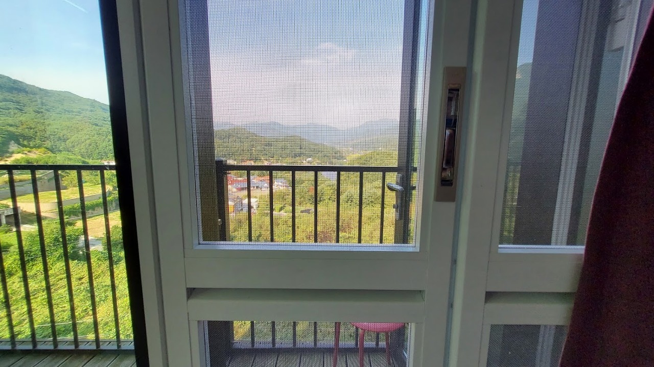 저기 가운데 은색으로 된 쇠 부분은 아래로 내려가 있고, 방풍망들 중간에 흰색 틈에 손을 넣고 당기면 문이 열립니다 ㅎ