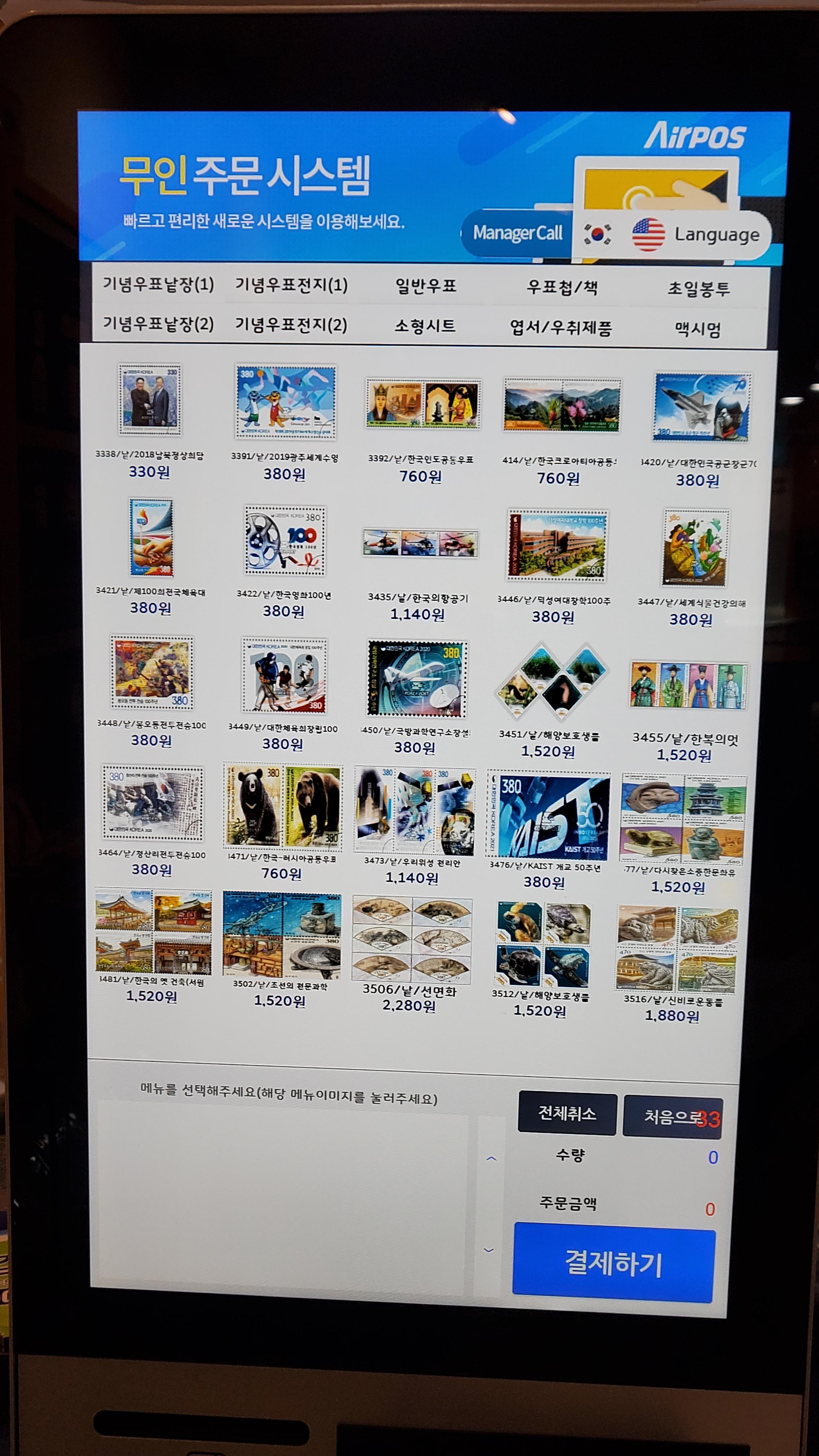 옆에 무인 우표 주문 키오스크가 있어서 우표를 몇 장 샀어요.