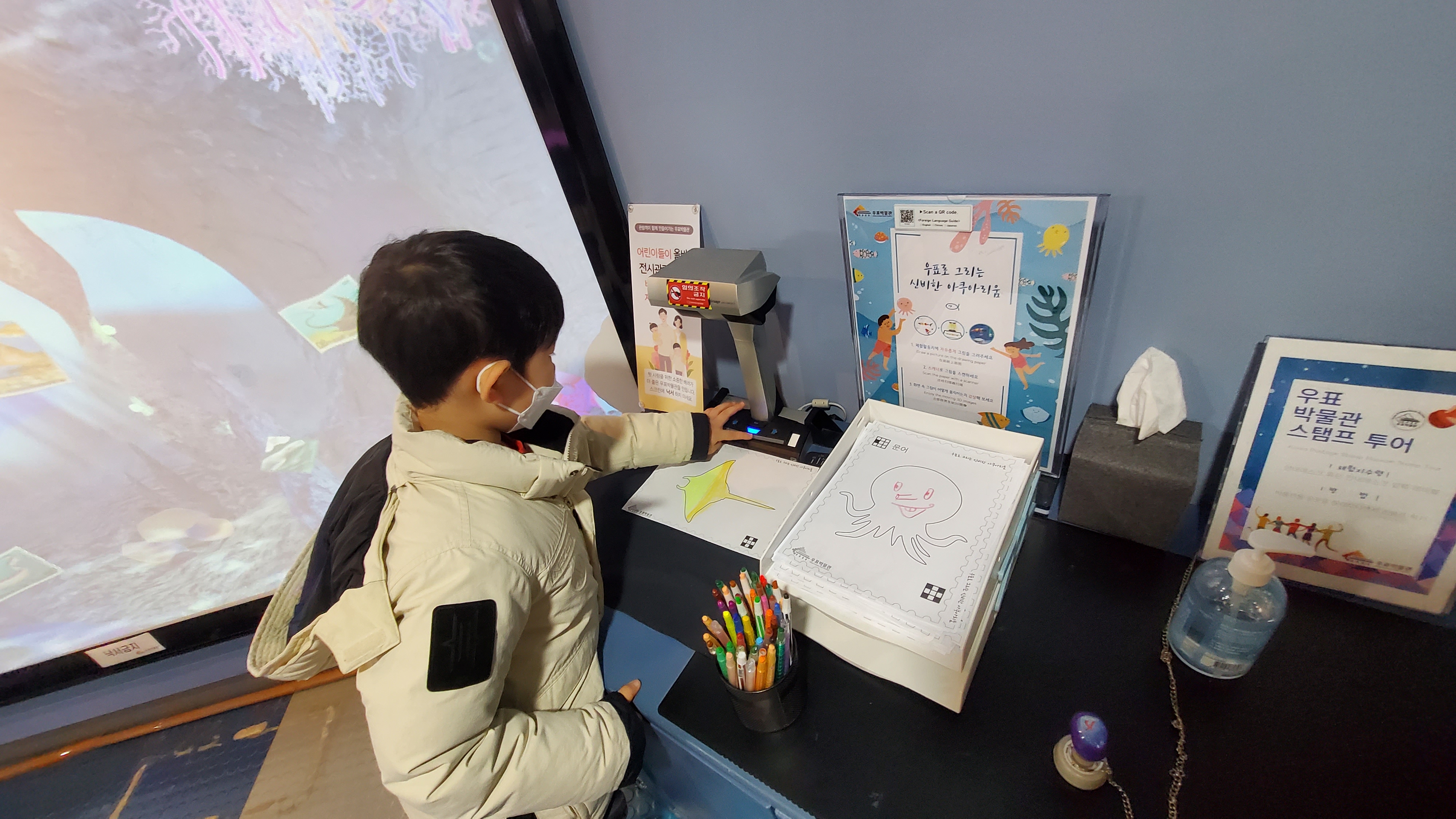 그 옆에 우표로 그리는 아쿠아리움이라고 있었는데, 놓여 있는 활동지에 색칠을 해서 스캔을 하면 왼편 화면에 자기가 색칠한 물고기가 나오는 거였어요 :)