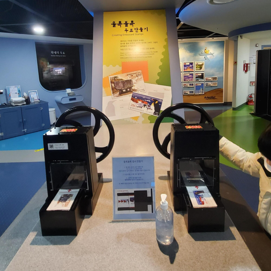 다음으로 본건 올록볼록 우표 만들기였는데, 입구에서 받은 엽서(저는 엽서인 줄 알았는데)를 여기에 밀어 넣고 핸들을 돌리면 엠보싱이 되는 거였어요.