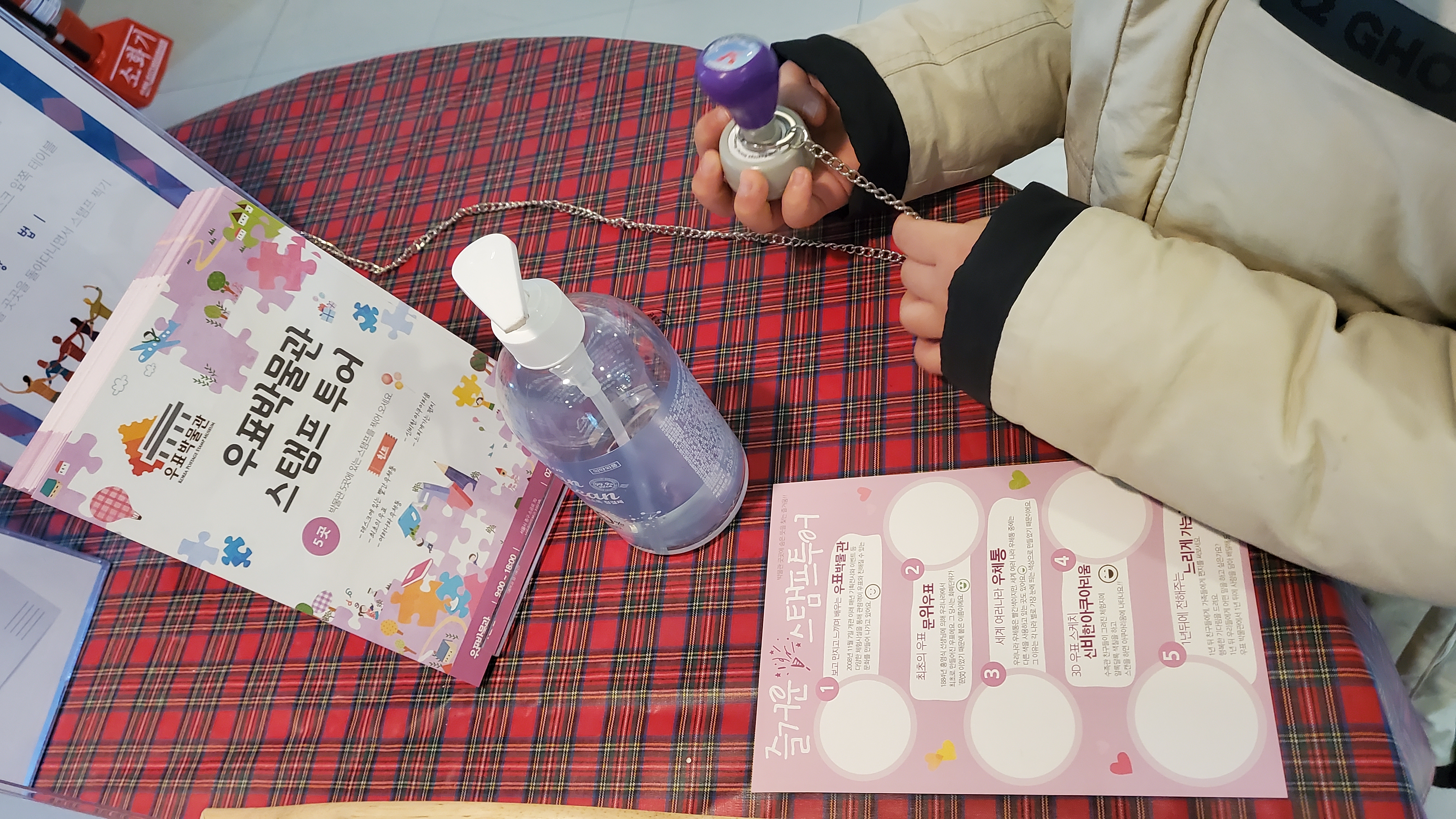하나씩 들고 들어갔습니다. 컬러링 체험지는 아들이 별로 관심이 없어해서 놔두고 갔어요.