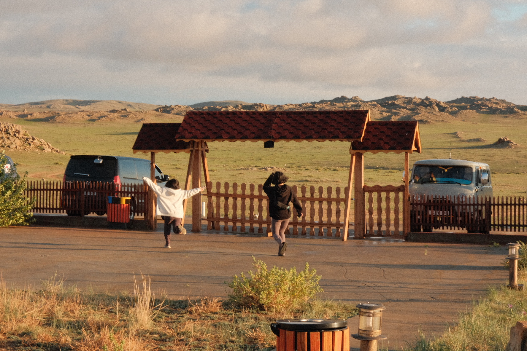 다시 푸르공에 다 같이 올라타고 20분 정도 달려서 첫 번째 게르 숙소에 도착했어요 :) 커다란 메인 빌딩이 하나 있고, 그 주변으로 수많은 게르들이 있었어요. 푸르공에서 짐을 다 내려서 숙소로 나눠져서 들어갔어요. 숙소에 어떻게 들어갈지 궁금했는데, 숙소 당 2~3명씩 들어갔어요. 이후 다른 게르들도 다 2~3명씩 들어가서 잤어요.