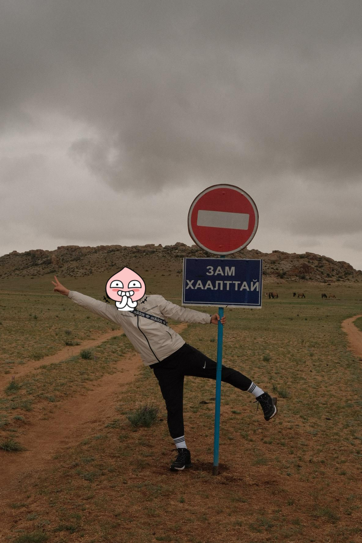2시간 남짓 갔나? 갑자기 차를 세우시더니 내려서 화장실 갈 사람은 다녀오고 쉬었다가 다시 출발한다고 하셨어요. 이때 사람들이 그 흔히 찍는 도로 샷을 찍으려고 찍었습니다. 다행히 비는 그쳤는데, 아쉽게도 하늘이 너무 흐렸어요. 몽골 하면 푸른 하늘과 끝없는 지평선, 그리고 밤하늘의 별인데 너무 속상했어요. 하지만 여행 시작하고 첫 단체 사진이라 나름 의미가 있는 것 같아요. 물론 공항에서도 찍었는데, 저희보다 먼저 들어오신 분들이 있어서 투어 시작하고 완전체로는 이때가 처음인 것 같아요. 보정하면 어느 정도 살릴 수 있을 것 같긴 한데, 일단 그날 그 느낌 그대로 간직하고 싶어서 보정은 안 했어요.
