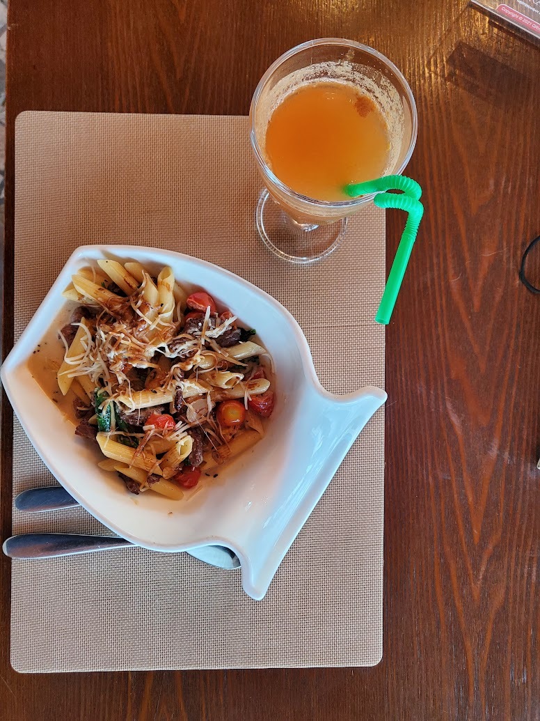 책을 10장도 넘기기 전에 음식이 나왔어요. 음료는 애플주스로 주문했는데, 판매하는 제품보다는 직접 만든 것 같았어요. 과즙이 살짝 느껴졌어요. 그리고 파스타를 한입 넣는데, "와 이 집, 뷰 맛집인 줄 알았는데, 그냥 다 갖춘 맛집이구나." 약간의 불편함으로 받았던 스트레스가 한 번에 해소되는 것 같았어요. 진짜 강력 추천해 드리고 싶은데, 저 말고도 한국 사람들이 좀 보이는 걸 보니 여기도 이미 좀 알려져 있는 곳 같아요.