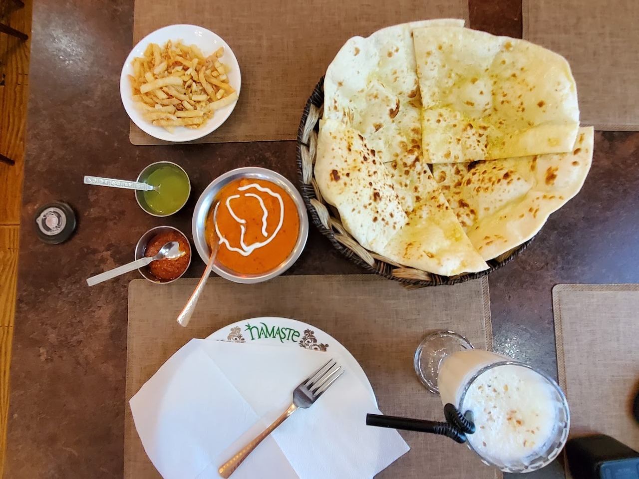 음식은 갈릭난에 버터 치킨 커리를 먹었어요. (갈릭난: 9.5K, 커리 27.5K, 스위트 라씨: 6.9k) 저는 커리랑 난은 맛있었는데, 라씨는 그냥 그랬어요. 그리고 애피타이저(?)로 감자 스낵 같은걸 주셨는데 제 입에는 별로였어요. 향신료도 같이 주셔서 곁들여 먹었어요.