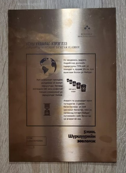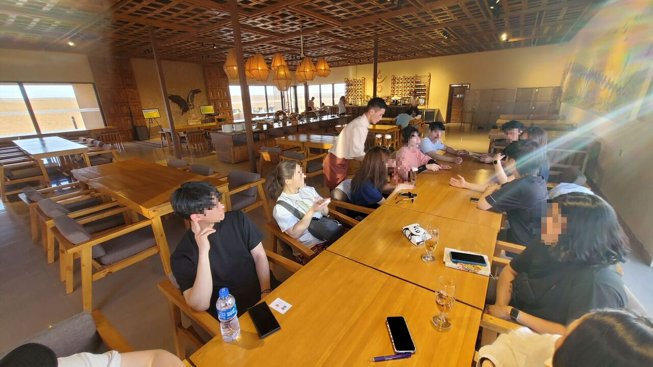 석식시간 7시 조금 전에 식당 앞으로 갔는데, 우리 팀 여자 동생들은 어떻게 알았는지 벌써 맥주 한잔씩 사서 시원하게 한잔하고 있었다. 뜨거운 사막에서 시원한 맥주 맛있어 보였다. 먼저 식당에 들어가서 종업원한테 이야기해서 우리들 다 같이 앉을 수 있게 12명 테이블 붙여서 자리 만들어서 앉아 있었다. 한명 한명 씻고 와서 자리에 착석했다. 아까 맥주 마시던 친구들은 주로 알탄 고비 맥주를 마셨는데 맛이 괜찮고 컵이 이뻤다. 나중에 울란바토르에 와서 혹시 잔이 파는지 찾아봤는데 아쉽게도 못찾았고, 한국와서 페이스북으로 컵 살수 있는 곳 문의해봤으나 답을 준다고 하구선 답이 없다. 혹시 구입할 수 있으면 후기 모임때 선물로 줄까했는데 아쉽다.