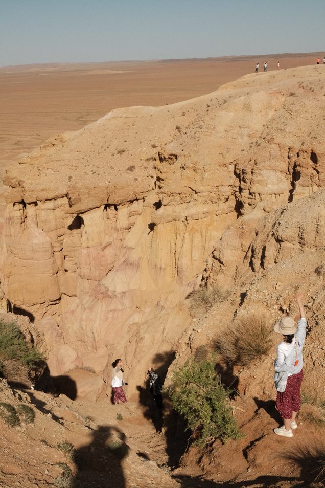 먼저 숙소에 도착해서 짐을 간단히 풀고 바로 푸르공을 타고 다시 출발했다. 오늘의 목적지인 차강소브라가는 차타고 20~30분정도 갔던 것 같다. 관광안내 표지판 같은게 있고 좀 더 걸어가니 기념비 같은게 있었고, 조금 더 가니 절벽들이 있었다. 여기는 다른 곳과 다르게 나무 데크 같은게 없어서, 미끄러지거나 할 수 있어서 꼭 운동화를 신는 것이 좋을 것 같았다. 여기는 과거에 바다였다고 한다. 그래서 그런지 여기는 석회암으로 이루어져 있다고 했다. 만약 우리가 여기를 먼저 왔더라면 우와 하면서 신나했을텐데, 여행 중반이 지나서 그런지 이제는 그냥 사진 빨리 찍고 가야지 약간 이런 생각마저 들었다.