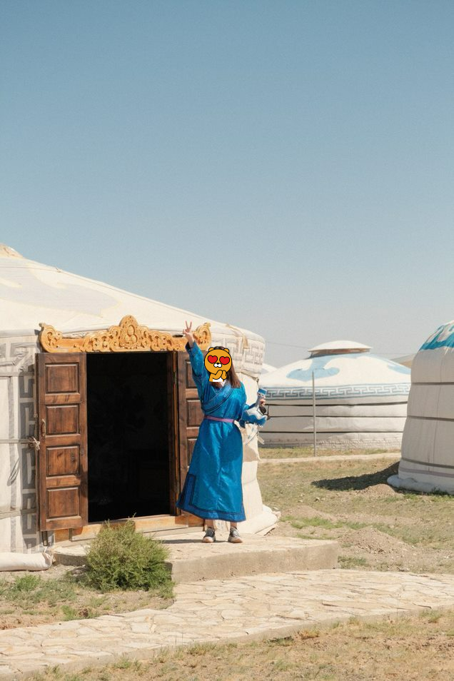 아침 먹고 게르로와서 짐 정리해서 푸르공 앞에 가져다 놓고 왔더니 다른 일행분들은 벌써 거의 몽골 전통복으로 다 갈아입고 사진을 찍고 있었다. 그리고 이미 내 옷을 골라놨는데, 정말 잘 어울렸다(?). 대학 친구들 카톡 방에다 올렸더니 '몽골 족장님, 이장님, 놈놈놈의 송강호냐, 귀화하냐' 뭐 난리 났다. 진짜 주변 사람들에게 큰 웃음 준 사진이라 나도 기분이 좋았다. 마음 같아서 프사 사진 하고 싶은데, 별로 안 친한 사람들 한테는 보여주기 싫어서 그냥 말았다. 생각해보면 우리는 한 장 정도씩 웃음을 주는 사진들을 찍은 것 같다. 어쩌면 기분 나쁠 수도 있지만 그 순간 나도 행복했고, 다른 모두도 행복했기에 불쾌가 아닌 즐거움으로 남을 수 있는 것 같았다. 나는 우리 어릴 때 마냥 본인이 인지하지 못하는 사진 찍었다가 기분 나빠할까 봐 망설였는데, 사진 다 공유하니 그냥 즐겁게 받아들여줘서 더 마음껏 사진을 찍어준 것 같다.