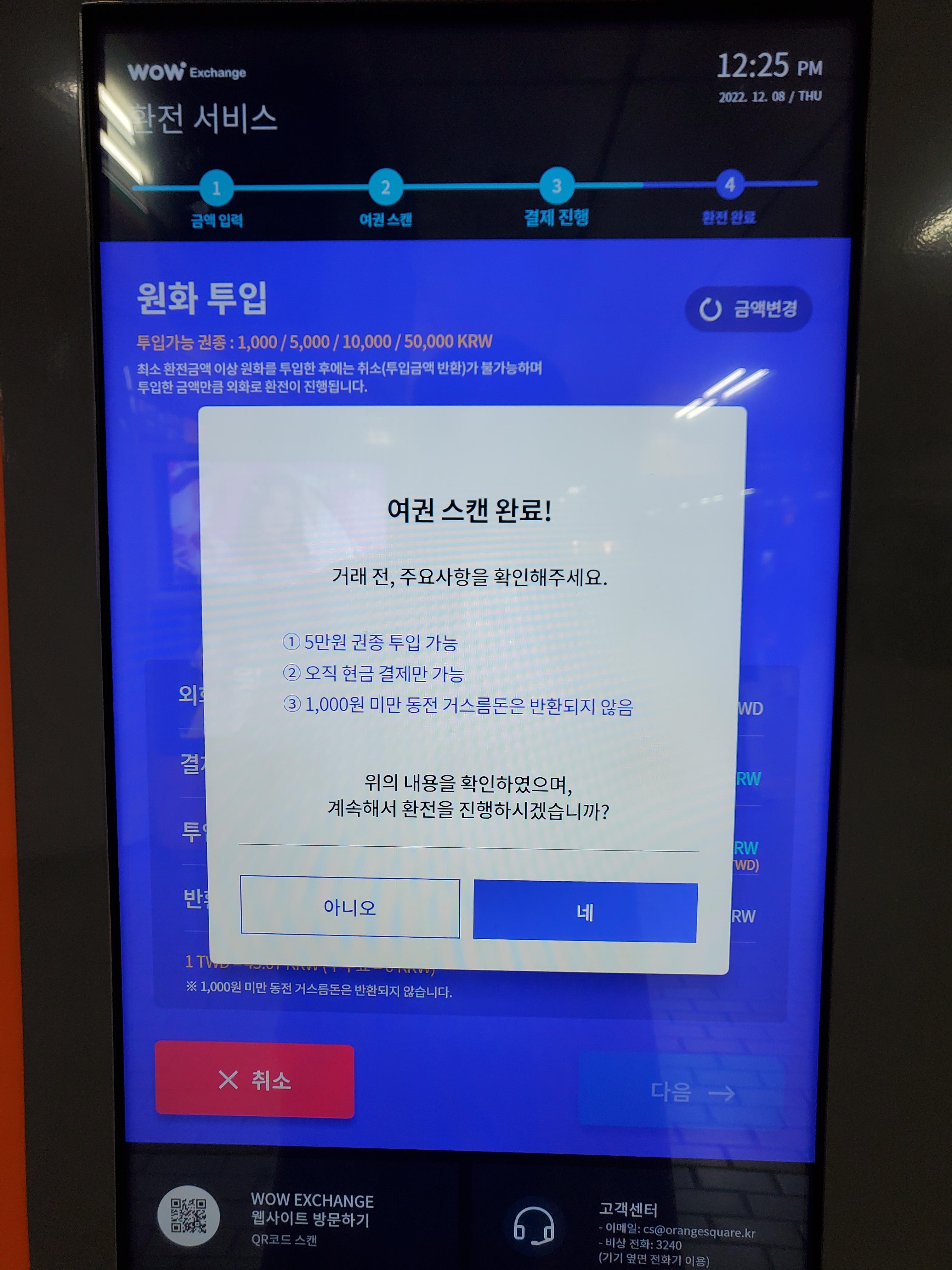 여권 스캔이 완료되면 입금할 것들을 알려주네요.