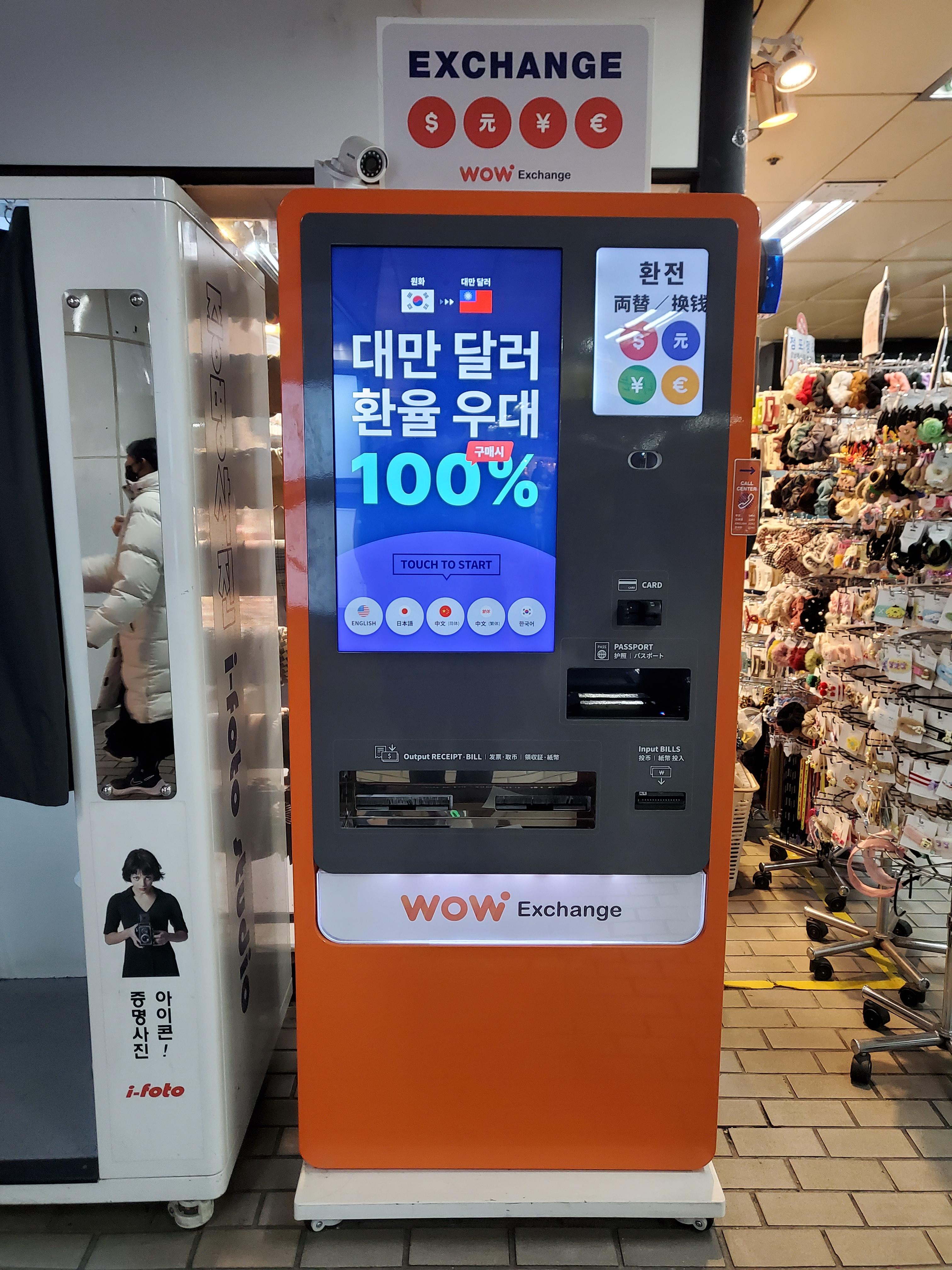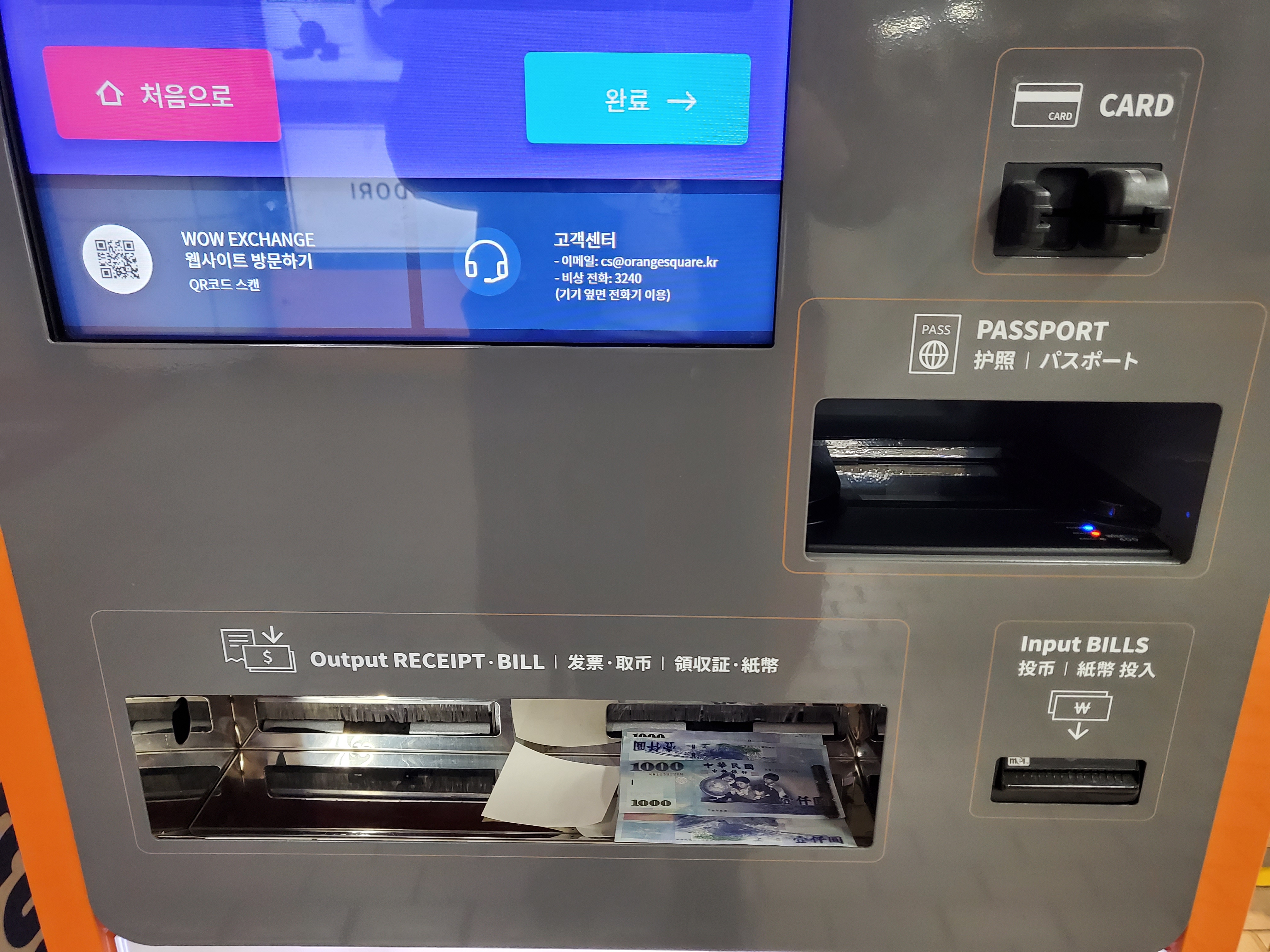 일단 새삥나는 듯한 느낌의 기계 앞에 섰어요. 저는 대만돈도 환전되길래 많은 나라들의 돈이 환전되는줄 알았는데, 그건 아니고 달러, 엔화, 대만달러 정도 환전됐었어요.