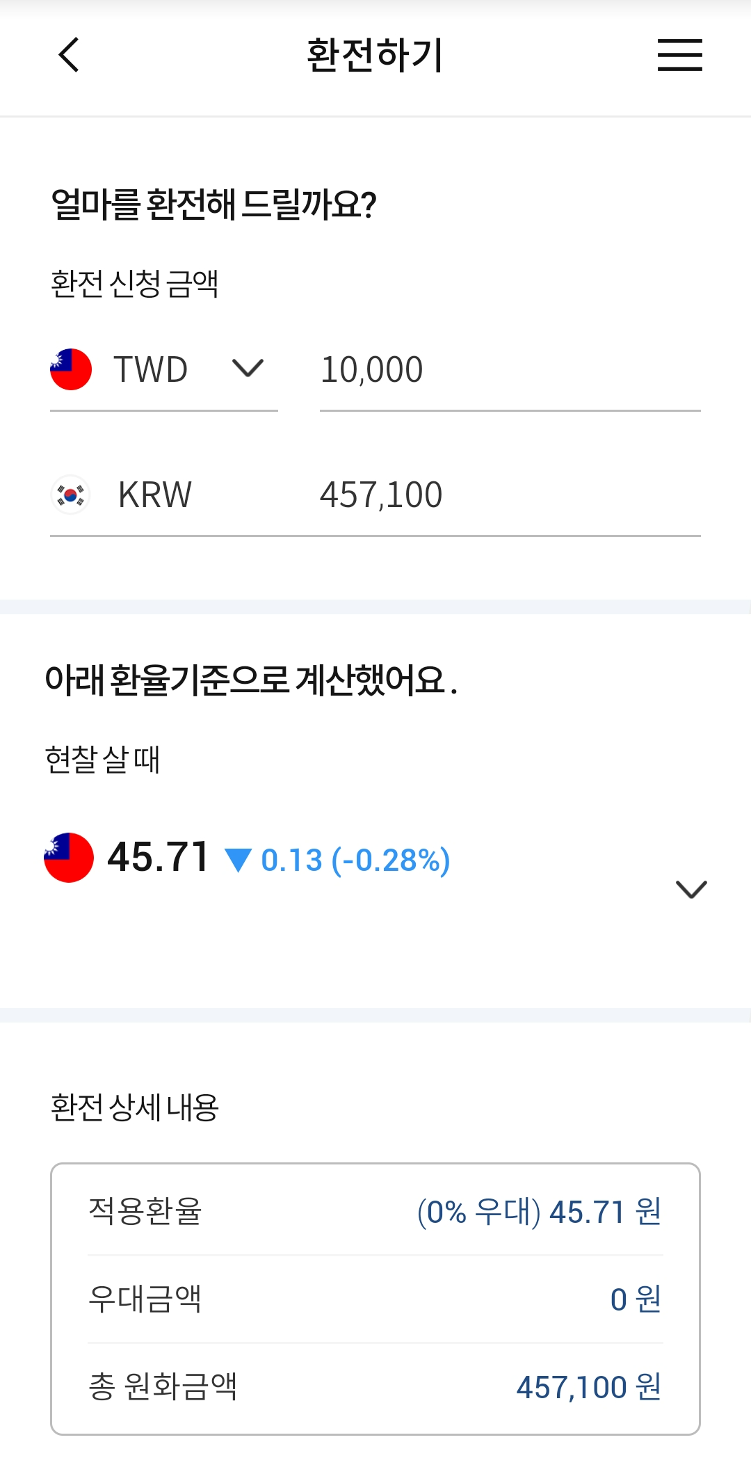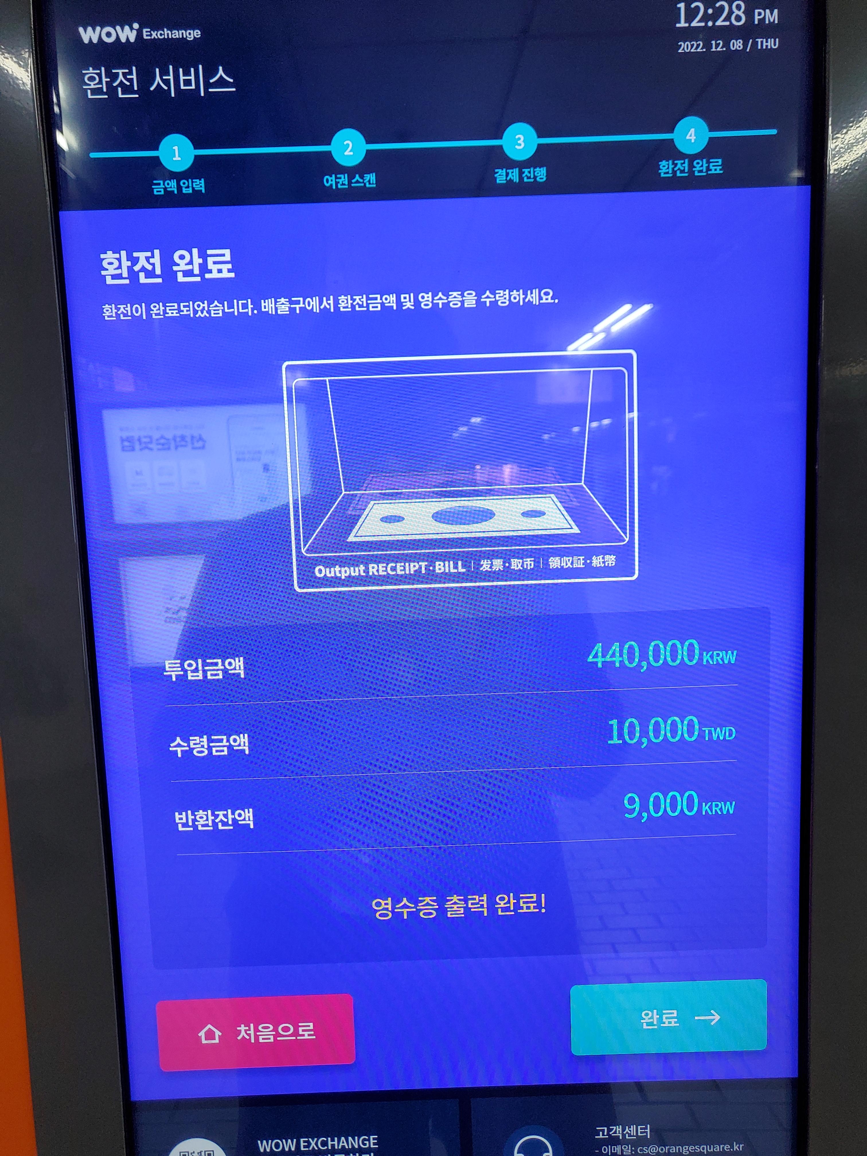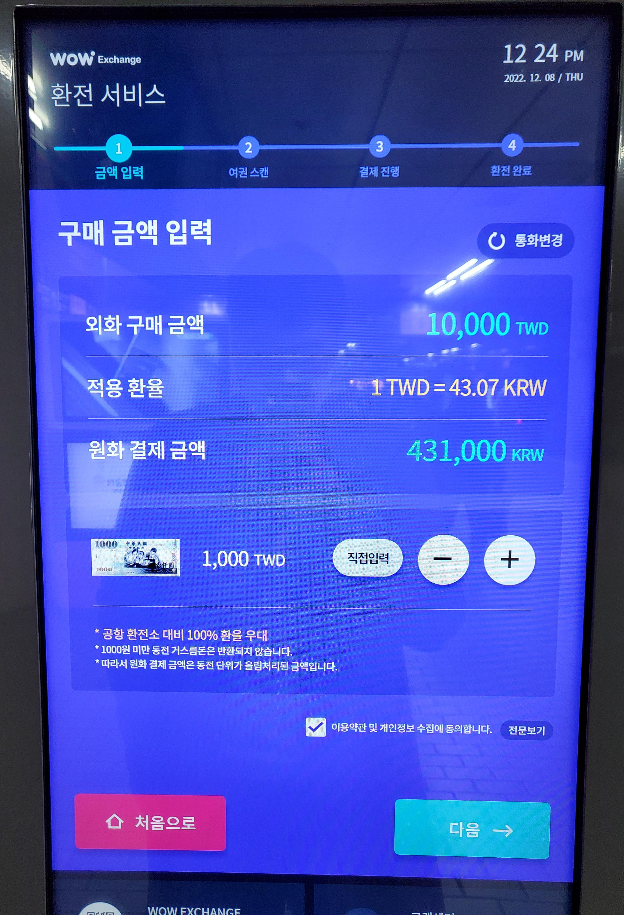 아무튼 동일한 10,000TWD 환전했을때, K은행은 458,700원, W은행은 457,100원, WOW exchange는 431,000원이 들었습니다. 이정도면 조금 귀찮아도 환전 기계 찾아가서 환전할만 하단 생각이 드네요
