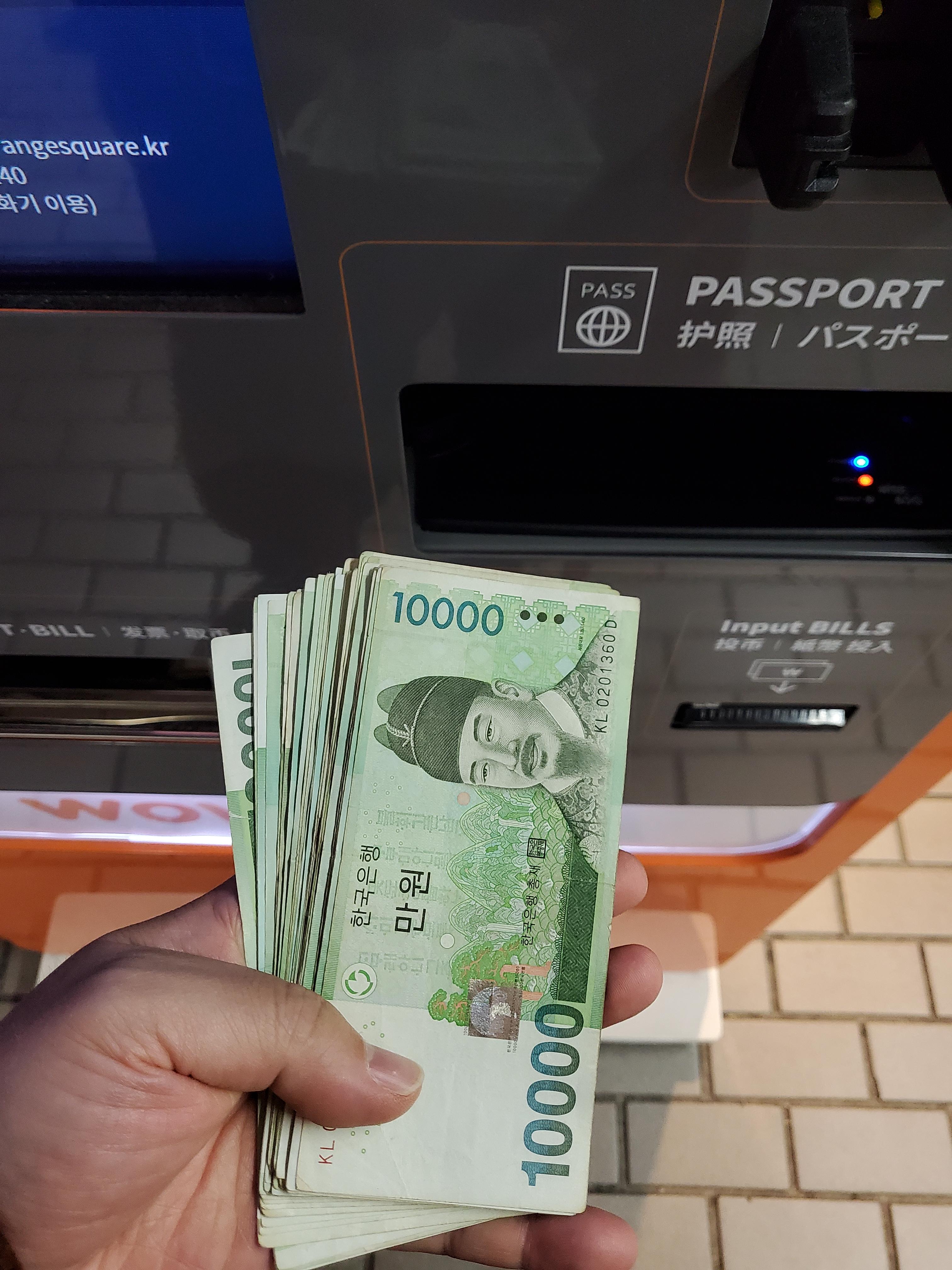 일단 준비물로 신분증(여권이나 주민등록증/운전면허증)과 돈이 있으면 됩니다. 주변 ATM기에서 현금을 뽑아왔는데, 다 1만원짜리로 출금되네요. 이거 한장 한장 투입하려니 현기증 오네요 ㅋㅋㅋ