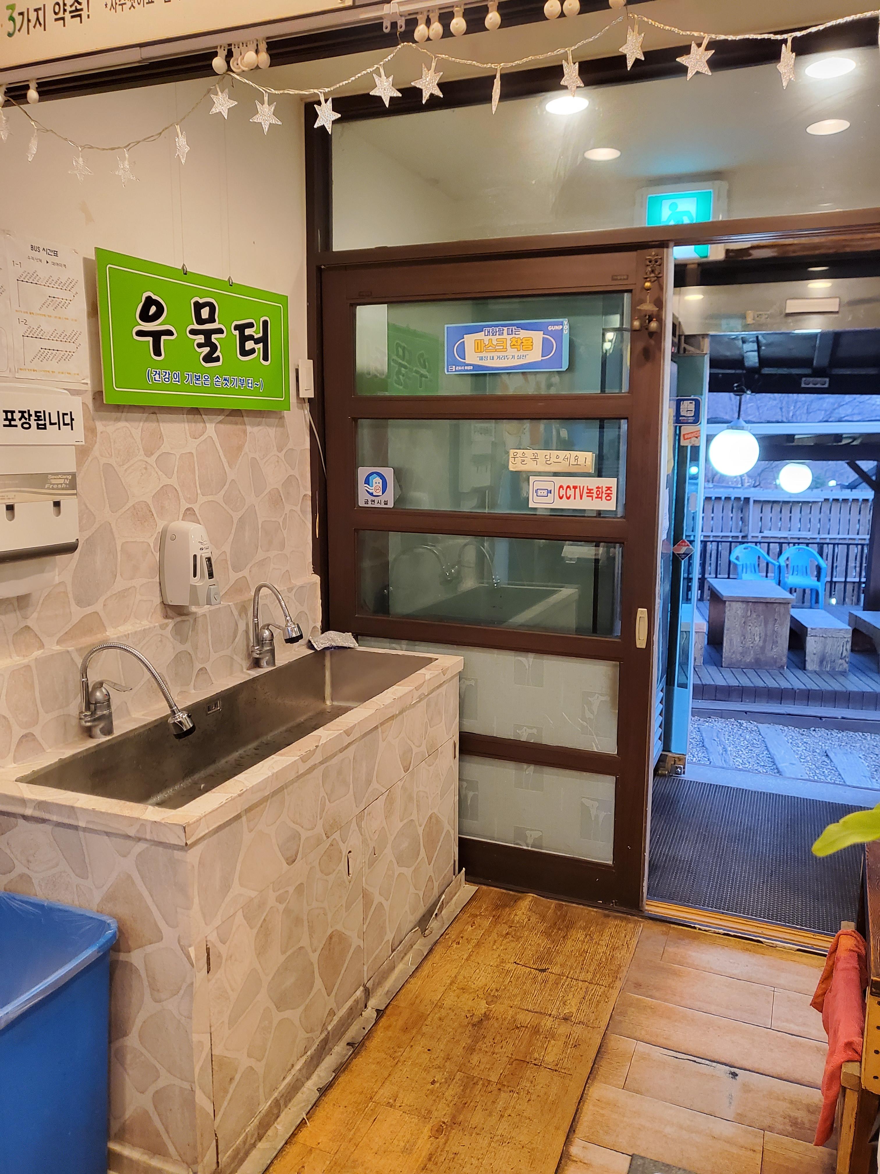 문을 열고 들어가자, 우물터라고 손을 씻을 수 있는 공간이 있었어요. 쌈을싸먹으려면 손을 씻을수 밖에 없으니 여기에 둔것 같아요. (말은 우물터인데, 싱크대 코브라가 있으니 조금 그렇네요 ㅎ)