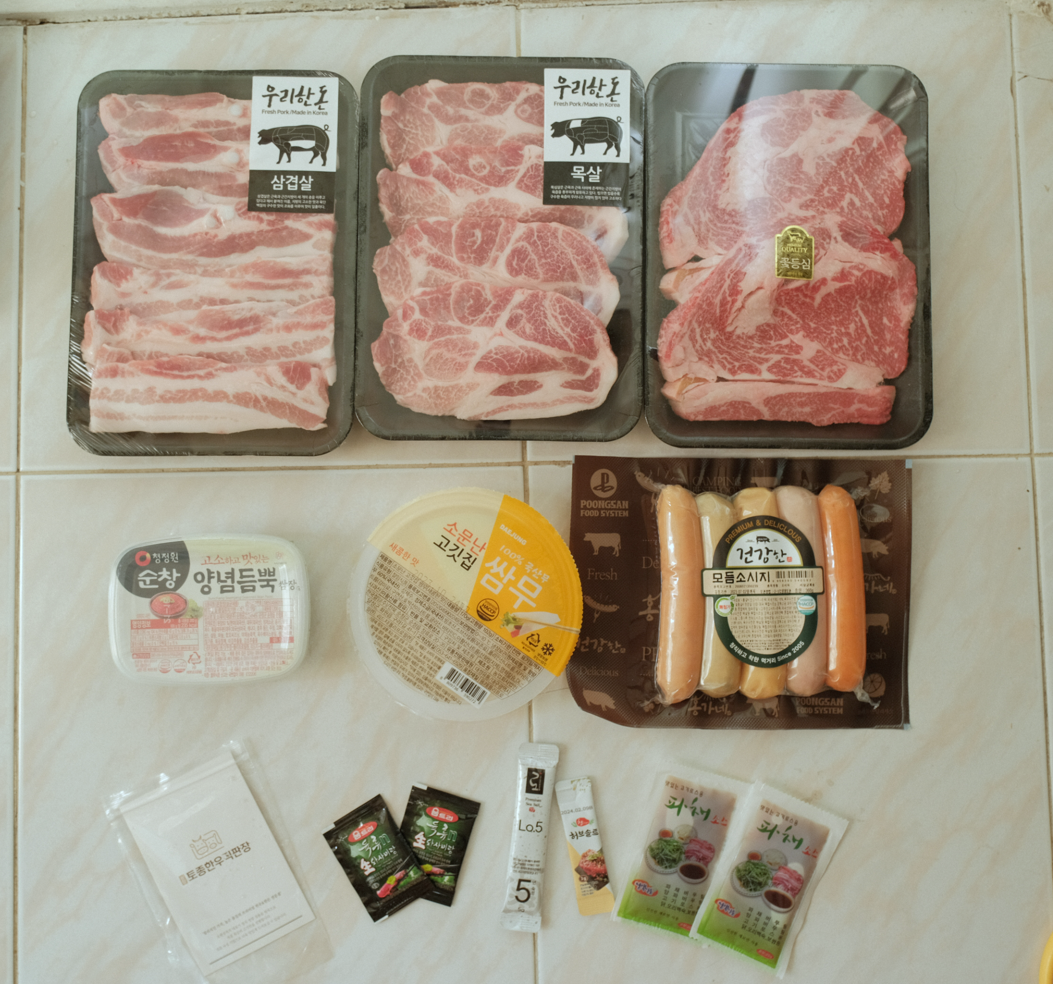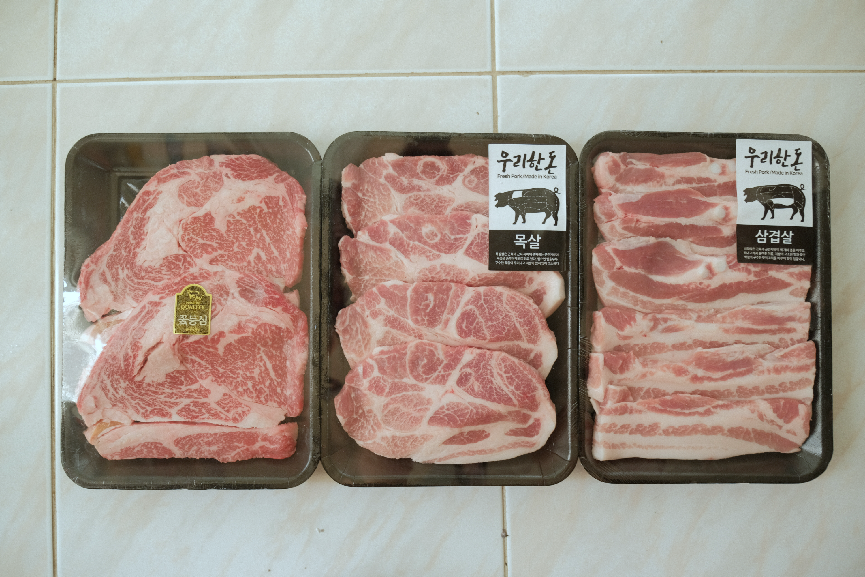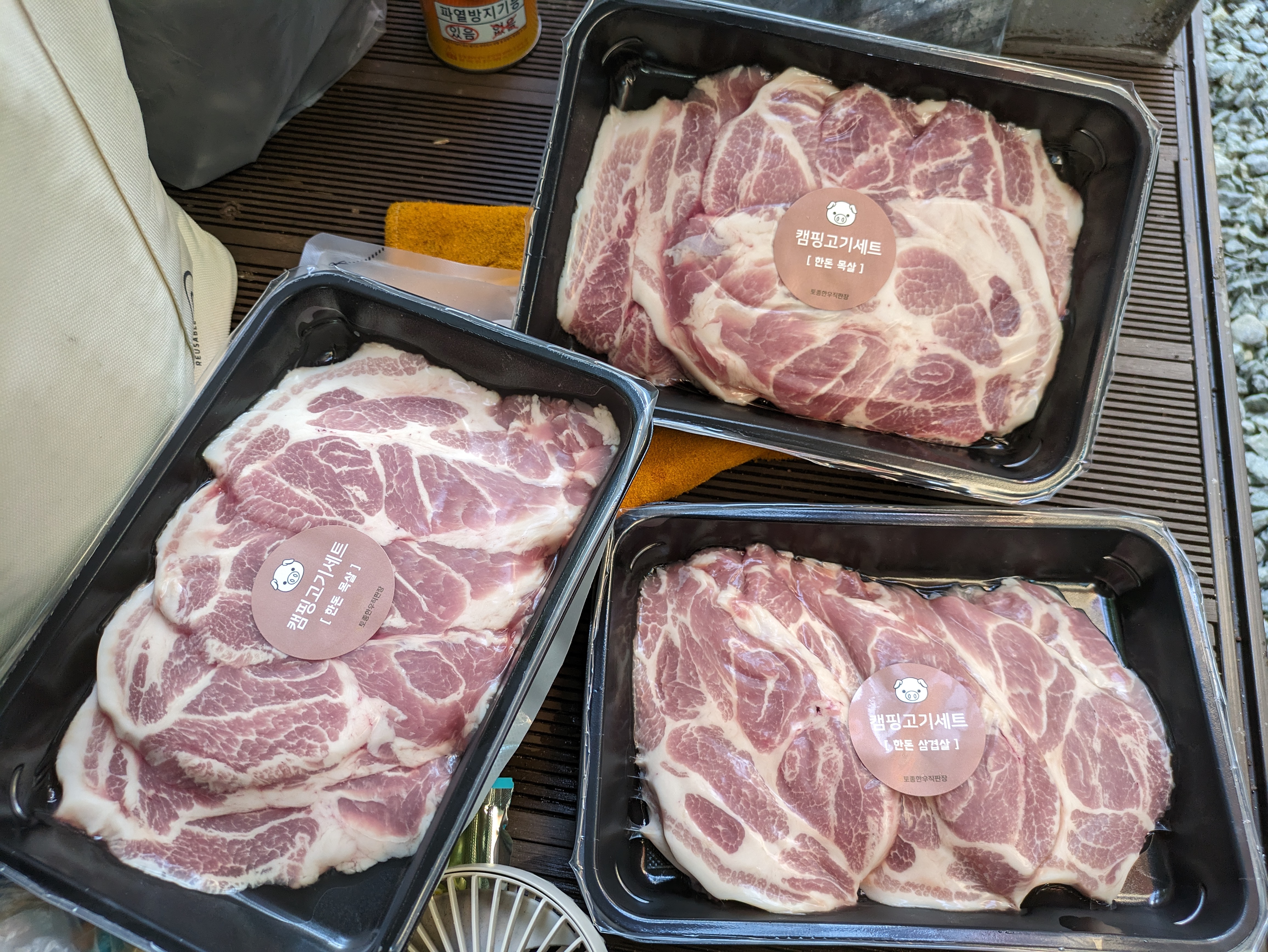 저희는 삼겹살, 목살, 그리고 소고기 꽃등심 이렇게 한팩씩 했어요.