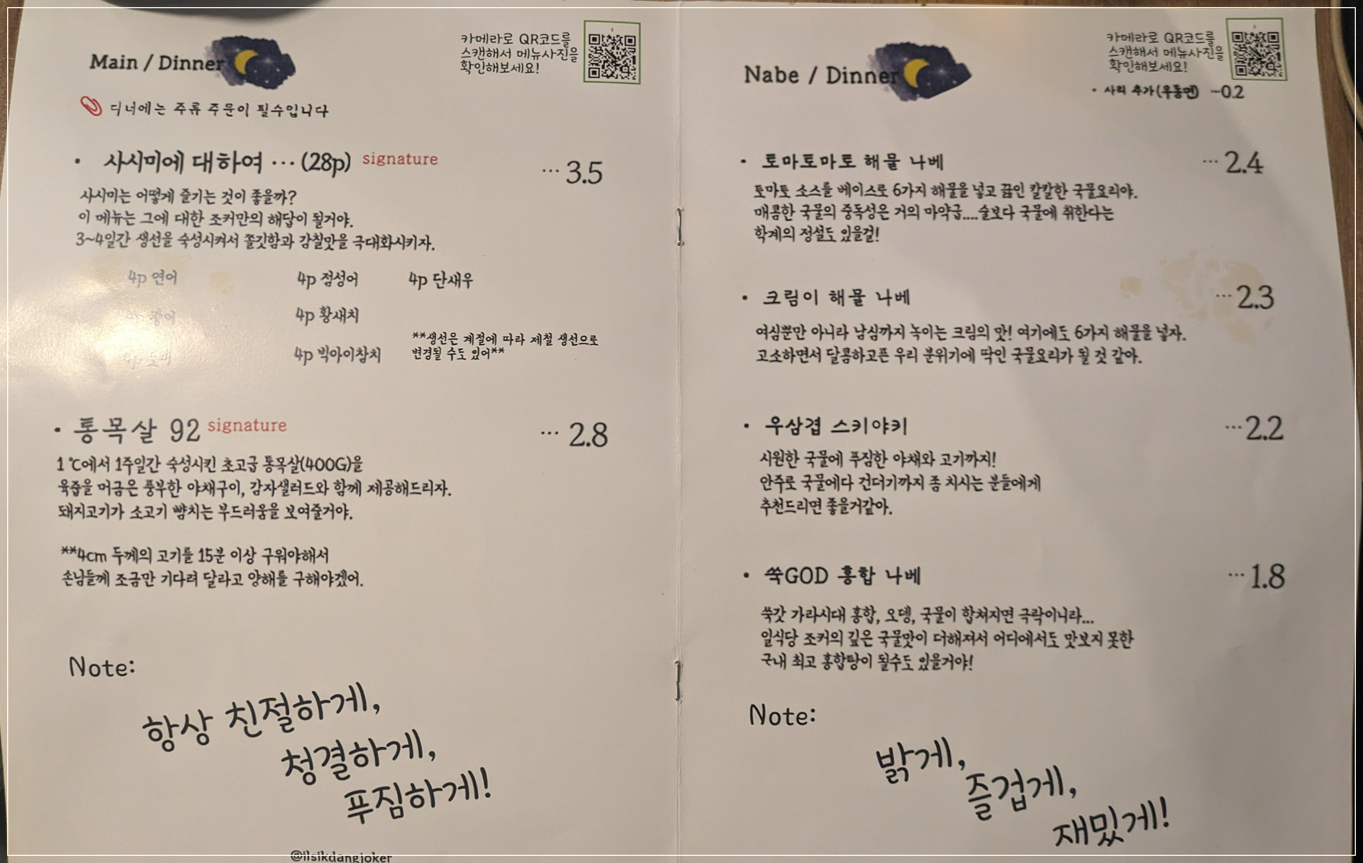 3. 통목살92 강추, 해물 나베 추천, 후토마끼는 쏘쏘, 사시미는 개취에 따라 다를 것 같아요.