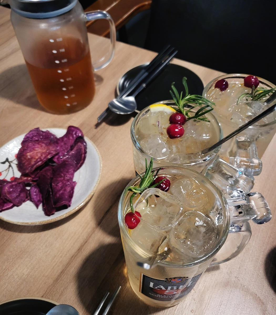 술을 드시는 분들은 하이볼을 시켜드셨는데, 이게 맛있다고 하시더라구요 ㅎ 많이들 드셔서 다음날 괜찮았냐고 물어봤는데 숙취도 그렇게 심하지 않다고 하셨어요. 기본으로 자색고구마 스낵 같은걸 주셨어요. 그리고 물은 생수가 아닌 차였는데 저는 마실만 했어요.(저는 술대신 마셔서 2병정도 마셨어요 ㅋ)