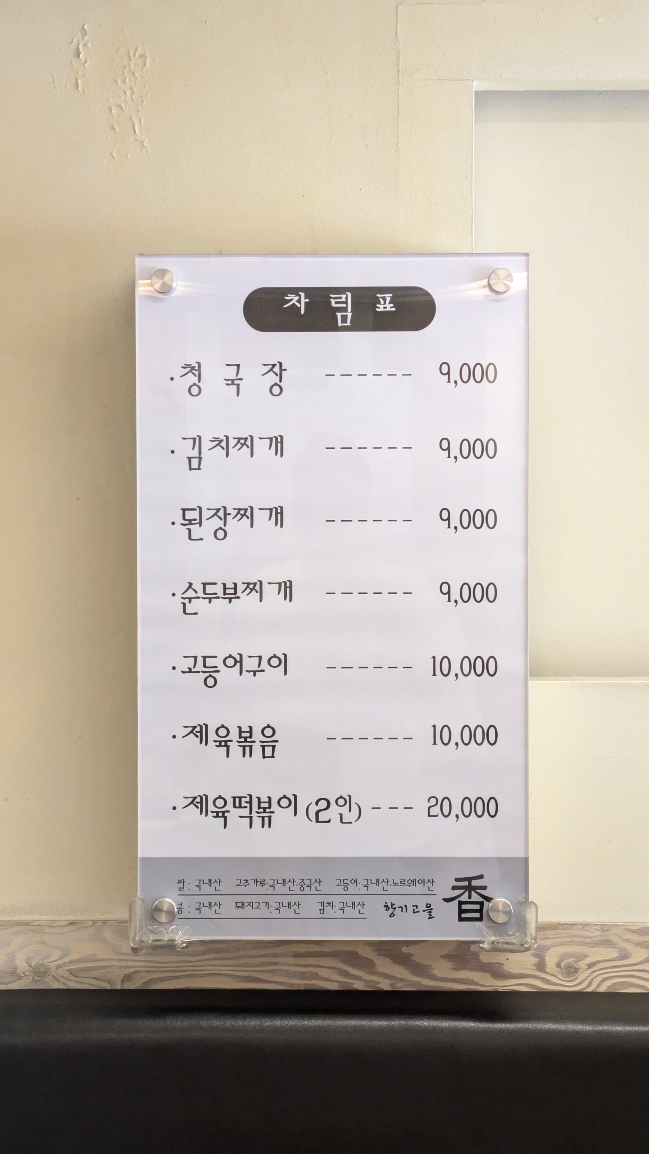 일단, 메뉴는 우리가 흔히 아는 청국장, 김치찌개, 된장찌개등 집밥 메뉴들이 주를 이뤘는데, 가격이 괜찮더라구요. 사실 한남동에서 식사 한번 하려면 만원은 기본이거든요. 처음 한남동으로 와서 동료들 밥사주고 커피 사줬더니 그날 일당날아가는 느낌이었어요 ㅋㅋㅋ