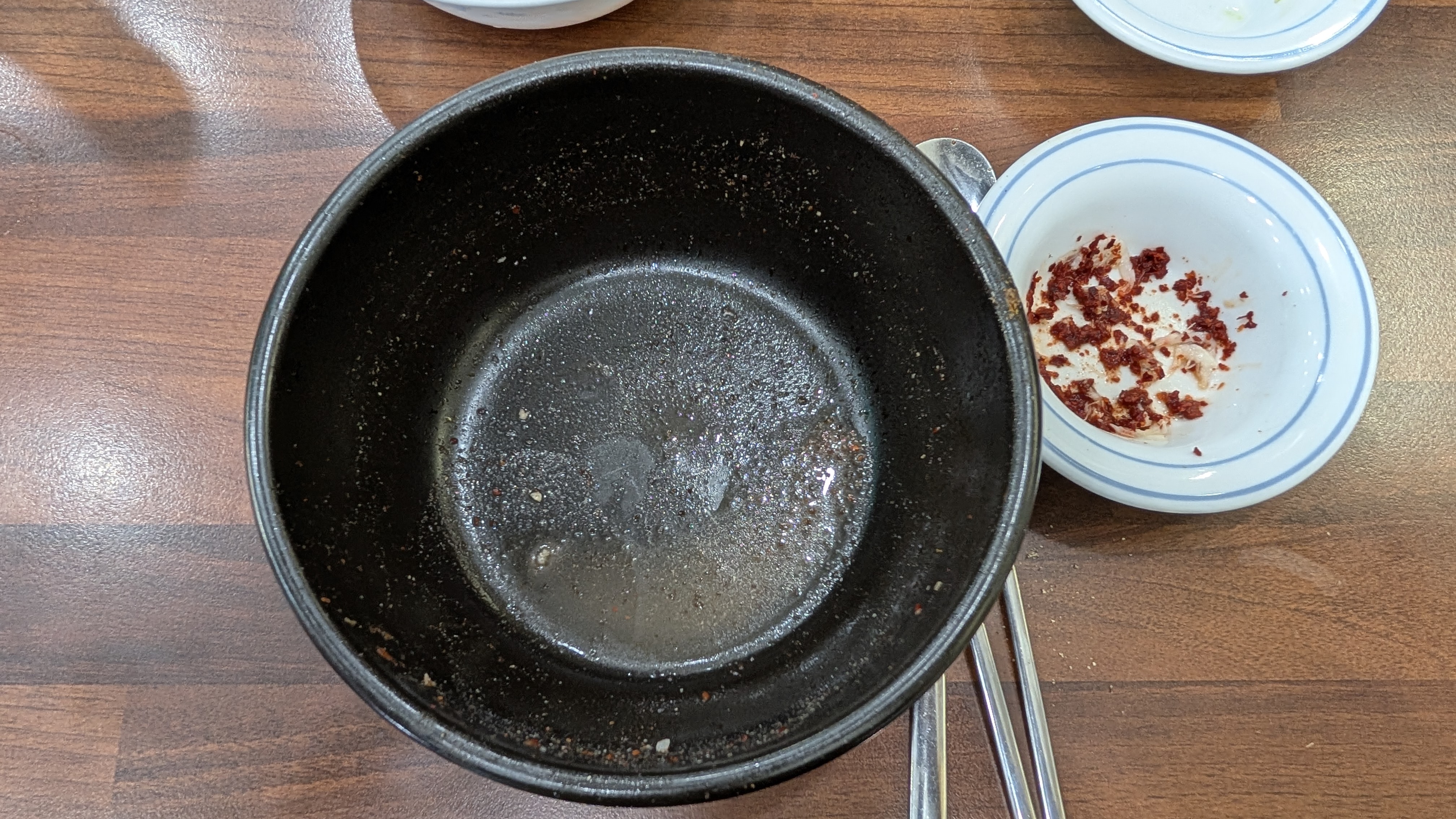 옆에는 소금, 고추가루, 새우젓이 있는데 조금 특이한건 새우가 다른집들에 비해서 좀 큰편이예요. 그릇에 덜어서 섞어서 찍어먹기도하고 국에 넣어먹기도 했습니다.