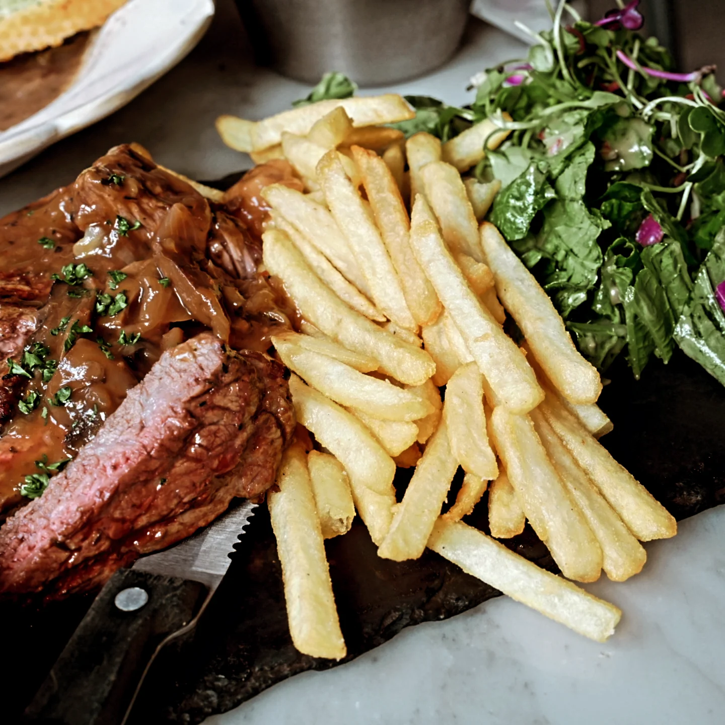 살치살 스테이크도 적절하게 익어서 맛있었어요. 감자 튀김은 그냥 그랬어요.
