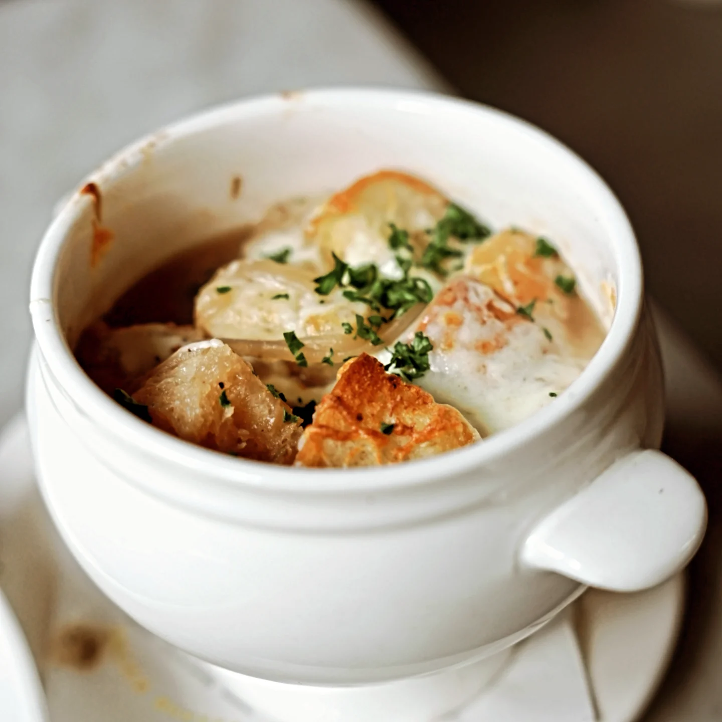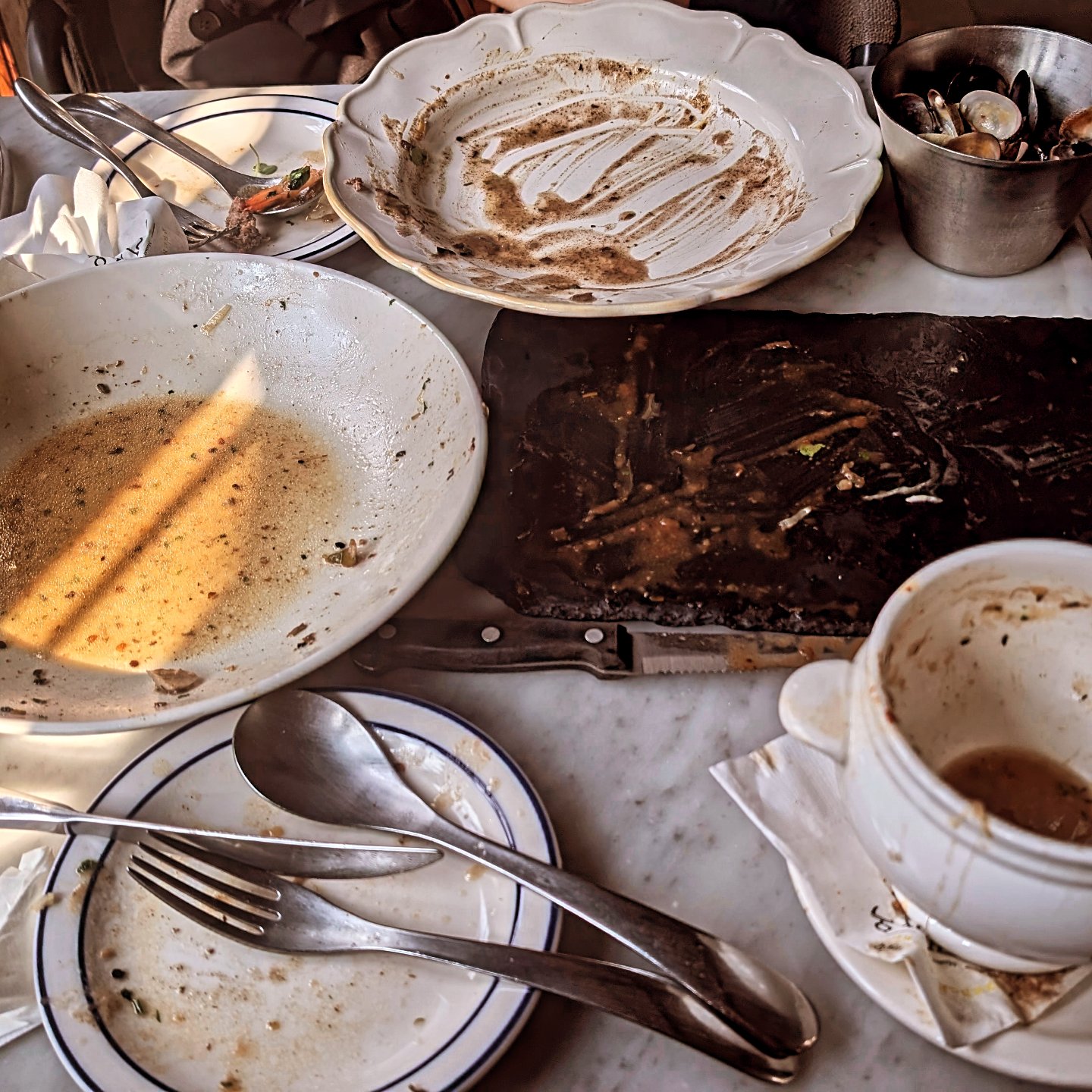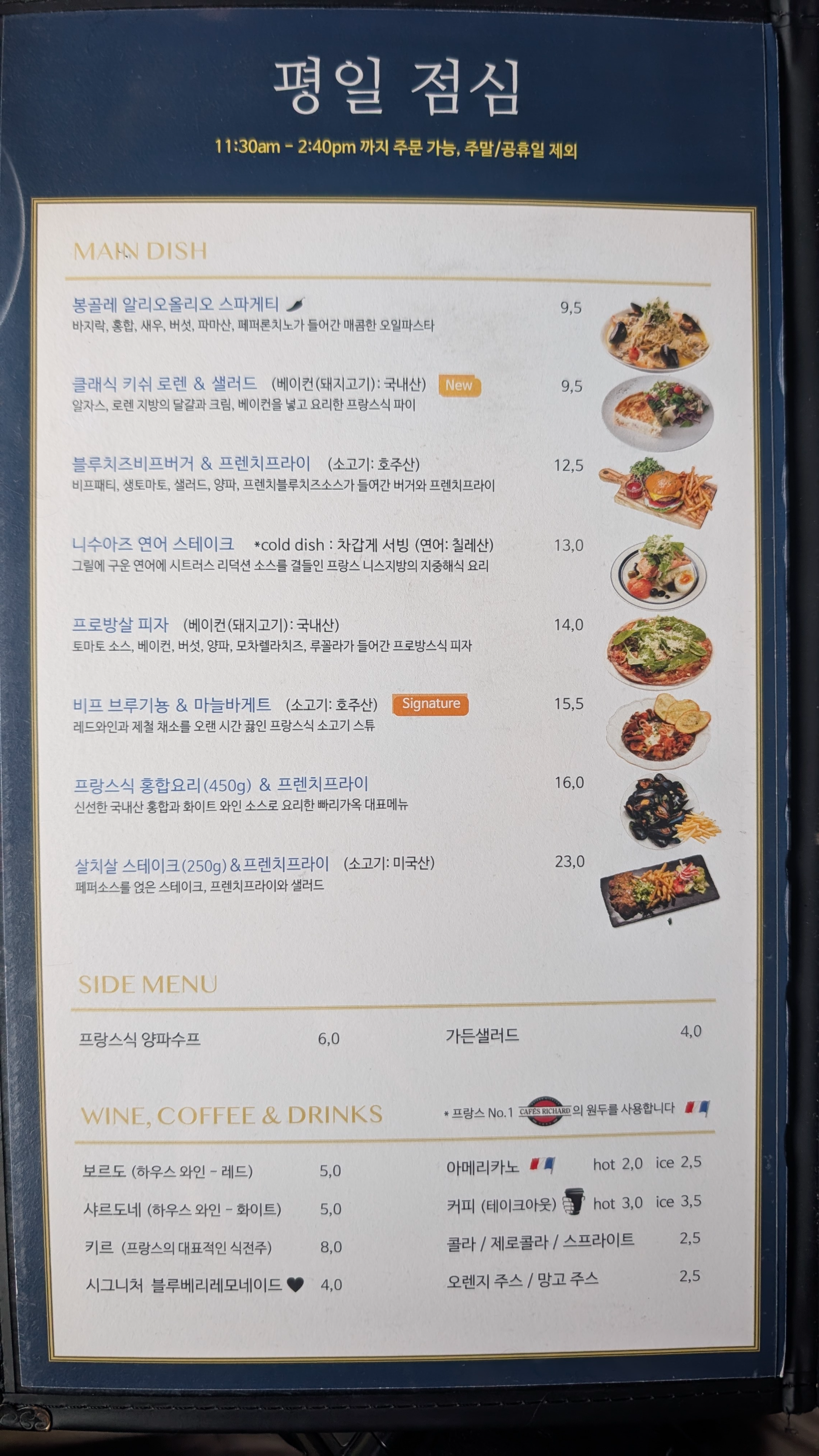 요리는 주요 주요 메뉴들 위주로 주문했어요. 양파스프, 봉골레 알리올리오 스파게티,살치살 스테이크&프렌치프라이, 비프 브루기뇽을 주문했습니다. 옆에 테이블에서 주문해서 드시는 거 봤는데 양이 그렇게 많아보이진 않았거든요. 오후 반차쓰고 와서 산책하고 늦게 먹으러 온거라 배가 고팠나봐요. 그리고 양파 스프는 무슨 쿠폰이 있어서 나중에 추가로 받았어요. 세개면 충분히 양도 많은데 양파스프까지 하니 너무 배불렀어요.