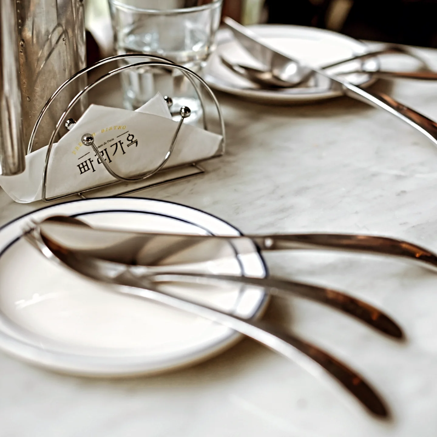 테이블 세팅도 일반적인 세팅이 아니라 포크와 나이프 스푼을 교차해서 세팅해뒀어요. 살짝 무게감이 있는 식기였어요.